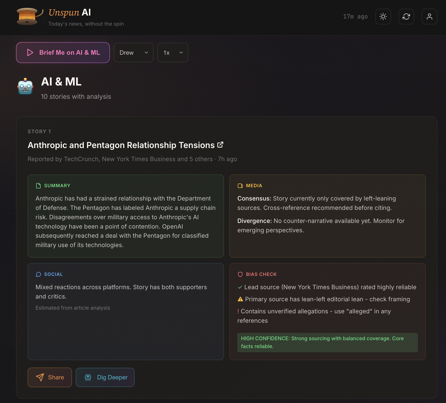 What began as a simple bias-detecting news app quickly evolved into a full platform. Unspun AI now delivers daily briefings with media consensus checks, source reliability ratings, and real-time social sentiment analysis powered by data from X. Users can ask follow-up questions about any story through a Perplexity integration, build personalized profiles around the industries, companies, and people they care about, and listen to broadcast-quality audio briefings powered by ElevenLabs.